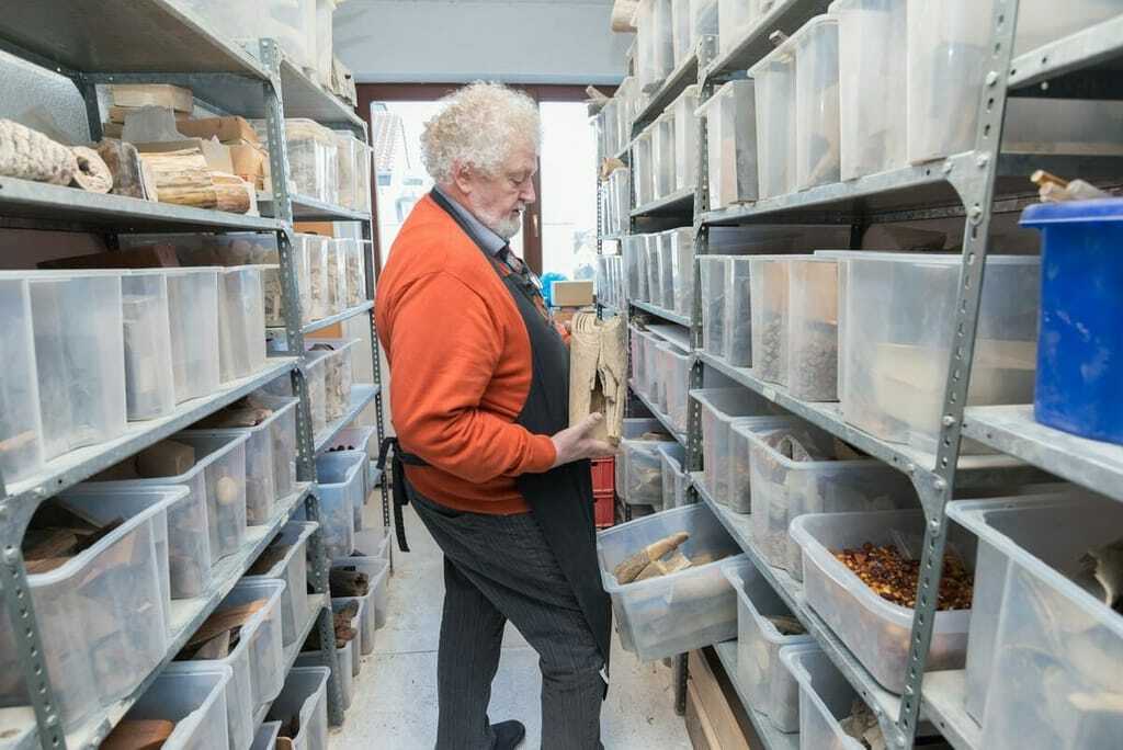 Faszinierend, sagt er, ist die lange Geschichte der Elfenbeinbearbeitung. "Mich treibt der Gedanke an, den Menschen zu zeigen, wie aus Elfenbein erste Kunst, Schmuckstücke und Musikintrumente entstanden sind. Elfenbein ist etwas für die Ewigkeit." Daher arbeitet er auch lieber mit fossilem Elfenbein. Elefanten gab es vor 40.000 Jahren in Europa nicht. Aber von dem Charaktertier der Eiszeit, dem wollhaarigen Mammut, lebten große Herden in der sogenannten Mammutsteppe. Seine anderen Werkstoffe wurden ebenso in der Eiszeit verwendet. Neben Kisten mit Mammutelfenbein lagern Gagat (Pechkohle), Bernstein, Geweihe aber auch Taguanüsse. Der Samen einer Palme, der aufgrund seiner Beschaffenheit und Verarbeitungsmöglichkeiten auch Elfenbeinnuss genannt wird. Über das wenige Elefantenelfenbein aus Altbeständen muss Röck präzise Buch führen und verwendet es deshalb kaum. Auch weil Elfenbein häufig im Zusammenhang mit Wilderei genannt wird. Elfenbeinschnitzer in China seien da nicht so zimperlich.