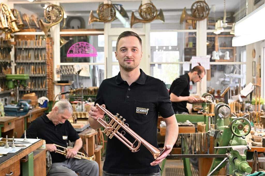 "Als ich 2017 die Meisterschule besuchte, tauchte das Problem erstmals auf. Da macht man sich schon Sorgen um die Zukunft", sagt Max Hertlein, der einmal den Traditionsbetrieb Werner Chr. Schmidt in Markneukirchen übernehmen möchte. Abwarten war für den inzwischen 30-jährigen Metallblasinstrumentenmachermeister keine Option. Hertlein suchte nach einem Weg, komplett auf Nickel und Blei zu verzichten.
