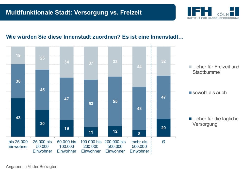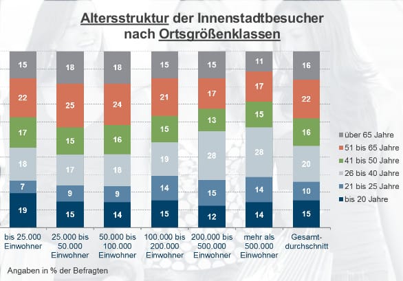 Jede Altersgruppe war in allen Groß- und Kleinstädten in der City vertreten. Für viele hat die Innenstadt sowohl die Funktion der täglichen Versorgung als auch für die Freizeitgestaltung – allerdings wächst der beigemessene Freizeitwert mit der Stadtgröße an. Umso größer die Stadt ist, umso weniger wichtig ist die Innenstadt für die tägliche Versorgung. Diese wird meist in der nahen Umgebung organisiert oder doch mit dem Auto in einem Einkaufzentrum am Stadtrand.