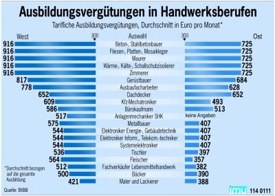 Die Ausbildungsvergütungen im Handwerk liegen unter dem Durchschnitt. In den einzelnen Ausbildungsberufen gibt es erhebliche Unterschiede.