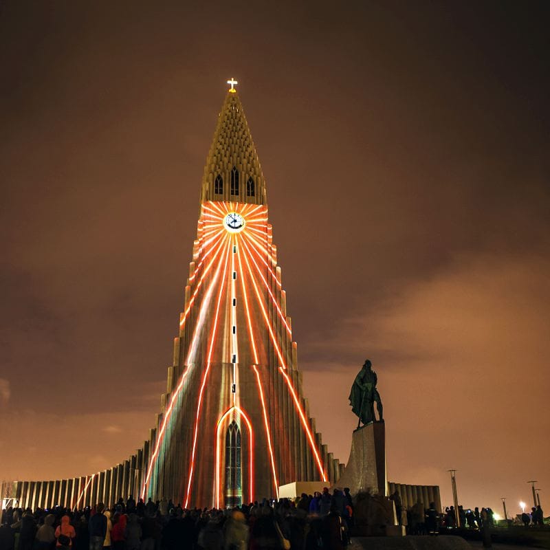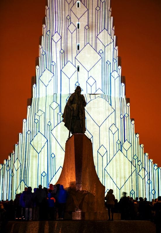 Die Kirche "Hallgrimskirja" ist das Wahrzeichen Reykjaviks und wird bei der Eröffnungsfeier zur Leinwand für die Lichtershow. - © Visit Reykjavik