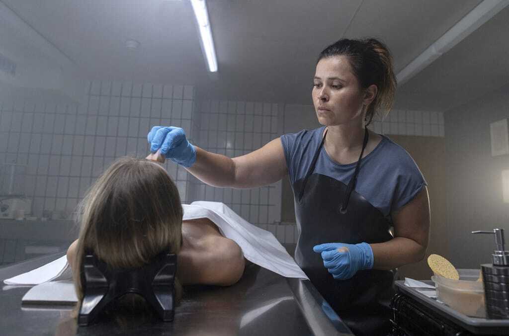 Aus Sicht des Handwerks folgen nun die aufregendsten Minuten des Films: Nach dem Abtransport der Toten sehen wir Lisa bei der Arbeit an der Leiche, die sie fachkundig säubert und retuschiert. Im Gesicht der Verstorbenen verschwinden schlimme Verletzungen, die sich die Frau beim Sturz zugezogen hat. Dann rückt ein Aspekt in den Blickpunkt, der unterstreicht, warum Bestatter so viel Einfühlungsvermögen wie keine zweite Berufsgruppe im Handwerk mitbringen müssen: Lisa führt ein Gespräch mit den Hinterbliebenen. Oliver Blum (Florian Jahr), der Ehemann des Opfers, und Kim Weckerle (Anna Unterberger), die Schwester der Toten, besprechen mit ihr die Option einer Einäscherung. Solche authentischen Einblicke in den Handwerksalltag kamen in den letzten beiden Folgen der Reihe viel zu kurz.
