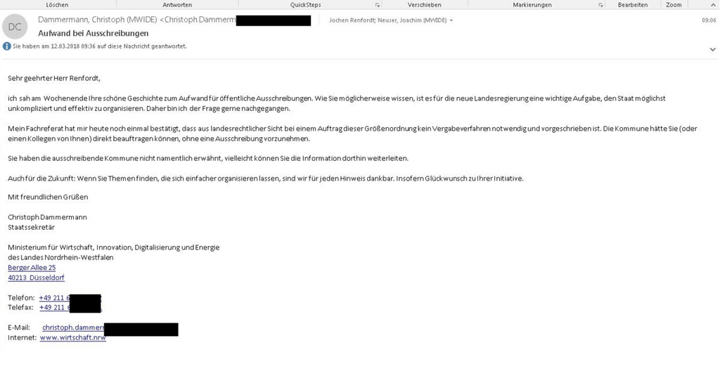 Kurz darauf erhielt Renfordt eine E-Mail aus dem nordrhein-westfälischen Wirtschaftsministerium. Staatssekretär Christoph Dammermann bestätigte darin, dass es sich in diesem Fall tatsächlich um einen unnötigen bürokratischen Aufwand handelt: "Mein Fachreferat hat mir heute noch einmal bestätigt, dass aus landesrechtlicher Sicht bei einem Auftrag dieser Größenordnung kein Vergabeverfahren notwendig und vorgeschrieben ist. Die Kommune hätte Sie (oder einen Kollegen von Ihnen) direkt beauftragen können, ohne eine Ausschreibung vorzunehmen," heißt es in der E-Mail. Mit dieser Reaktion hatte Renfordt nicht gerechnet. Er veröffentliche die Mail ebenfalls auf seinem Blog und freute sich über die Reaktion "von da oben".