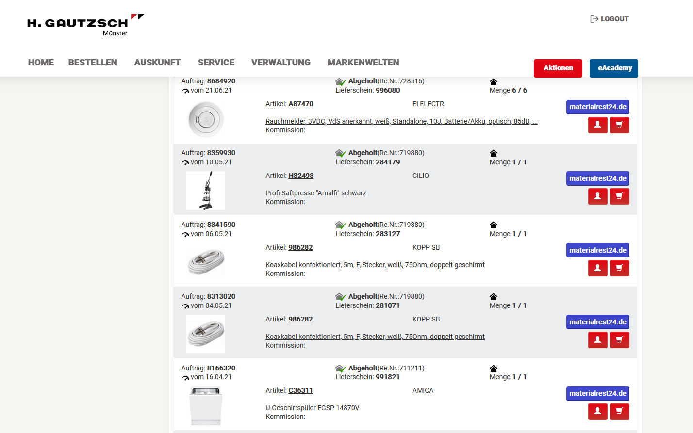 Den Nutzern des Shops von H. Gautzsch ist es seit Anfang November allerdings möglich, den Aufwand für einen Verkauf von Materialresten über einen Onlineshop zu reduzieren. Sie können über das Auftragsarchiv des Shops aufrufen, was sie bisher gekauft haben. Wenn Reste davon vorhanden sind, können sie sie ganz einfach weiterverkaufen. "Dabei geht es alles, was wir nicht als normale Retouren zurücknehmen können, wenn etwa Verpackungen geöffnet sind", sagt Peter Benthues. "Über einen Button gelangt man direkt zu materialrest24.de. Hier muss man nur noch die Anzahl und den Preis der Waren angeben. Artikelbeschreibungen und Fotos werden aus dem Onlineshop übernommen", erklärt Simon Schlögl den vereinfachten Verkaufsprozess.