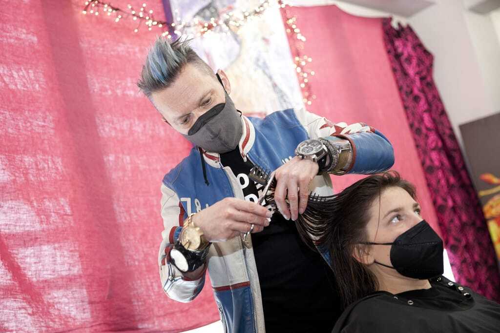 Friseurmeister Günther Fischer von Art of Hair Kaufbeuren schneidet Krankenpflegerin Monika Maurus die Haare. - © bild-text-ton.de
