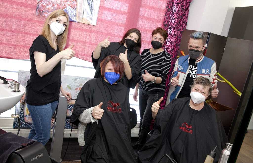 Daumen hoch für die Aktion "kostenloser Haarschnitt für Pflegekräfte". Von links, vorne: Friseurin Sandra Fischer und die Kundinnen Claudia Bauer sowie Ute Düring, von links, hinten: Kundin Monika Maurus, Birgit Wölfl (KH Ostallgäu/Kaufbeuren) und Friseurmeister Günther Fischer. - © bild-text-ton.de
