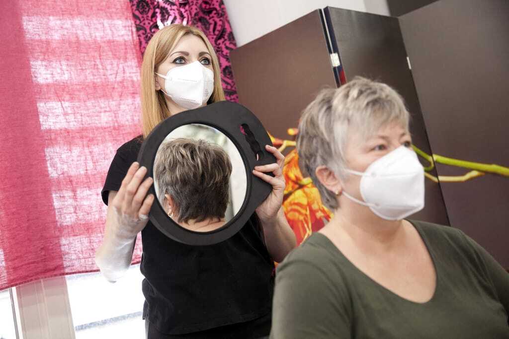Sandra Fischer (links) zeigt ihrer Kundin Ute Düring das Ergebnis des Friseurbesuchs. - © bild-text-ton.de