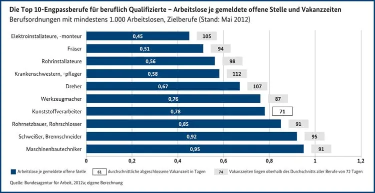 Nach Angaben der Bundesagentur für Arbeit liegen vor allem in den gewerblich-technischen Berufen aktuell gravierende Engpässe vor. So würden derzeit zu den zehn Berufen mit den größten Engpässen neun Berufe aus dem gewerblich-technischen Bereich gehören, zeigt die Engpassanalyse 2012 des Bundeswirtschaftsministeriums.