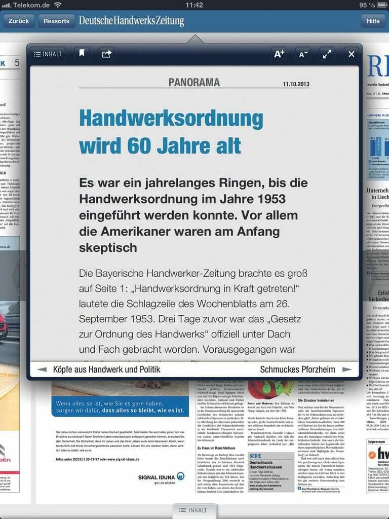 Beste Lesbarkeit: Einen Text auf der Seite kurz angetippt – und er wird groß. Im Textmodus lassen sich die Artikel bequem lesen. Die Schriftgröße kann mehrmals vergrößert werden. Zudem ist im Textmodus ein Inhaltsverzeichnis integriert, um direkt zu den gewünschten Artikeln zu gelangen. Und die Funktion Merkliste gibt es auch, wenn Sie den Artikel speichern wollen. Auch können Sie den Text von hier Ihren Kollegen direkt weiterversenden und empfehlen.
