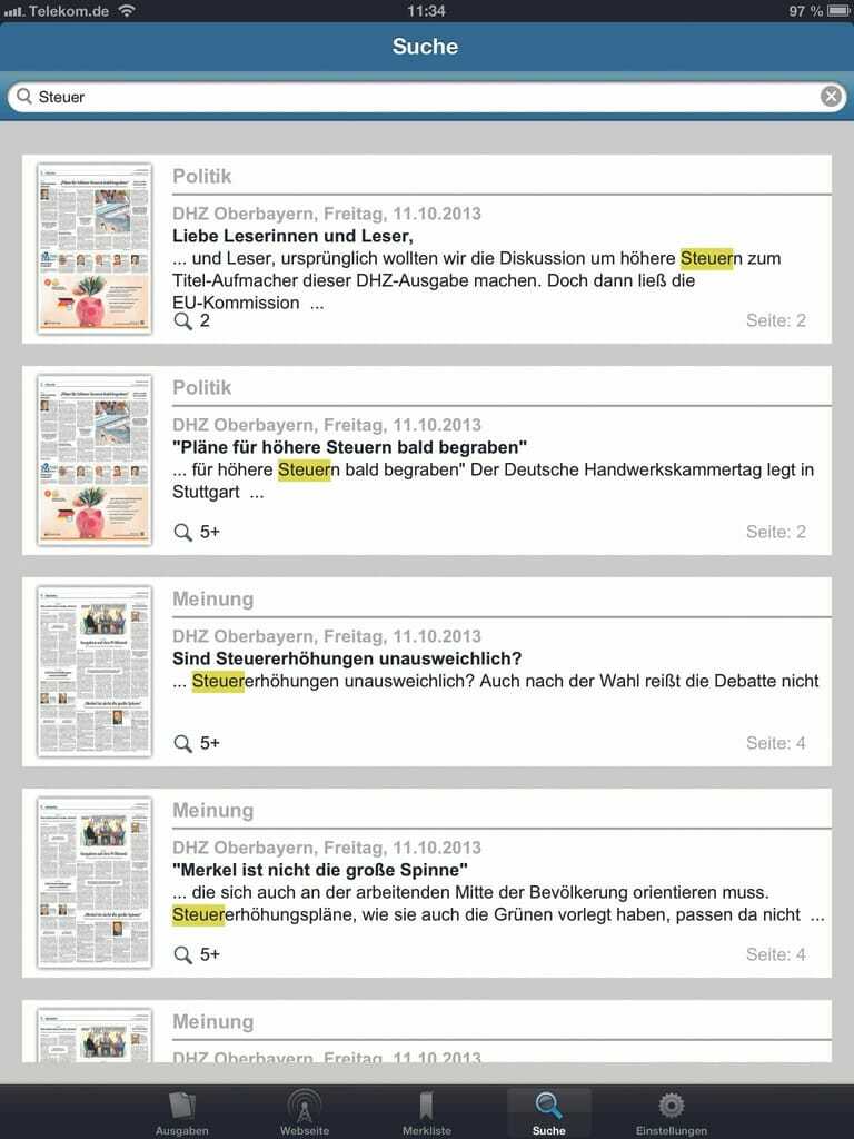 Schnelle Suche: Oft suchen Sie nach Informationen und haben die richtige DHZ-Ausgabe nicht mehr zur Hand? Das ist in Zukunft per App kein Problem mehr. In der Suchmaske der App können Sie per Schlagwort auf einfache Weise nach Ihren Themen suchen. Und das in sämtlichen Ausgaben. Damit besitzen Sie erstmals ein digitales Archiv für Ihre Kammerzeitung.