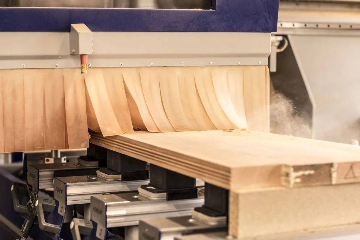 Nun kommt diese auch zum Einsatz: Auf der Arbeitsfläche liegt eine große, massive Holzplatte. Daraus soll nun eine maßgefertigte Tür gefräst werden. Das Werkstück liegt nun vakuum-gespannt auf dem Arbeitsbereich der Maschine, damit dieses auch ohne Probleme ringsherum bearbeitet werden kann. Der Handwerksmeister von 2013, Thomas Heußlein, steht an seinem PC, macht ein paar Klicks und schon beginnt die CNC-Maschine an zu arbeiten. Sie greift sich ein vorinstalliertes Werkzeug, fährt an der Vorderseite der Holzplatte entlang und fräst eine Kante hinein. Dieser Vorgang wird nochmals wiederholt, damit die Kante auch möglichst sauber wird, denn „das größte Problem, welches wir in der Schreinerei haben, sind die Kanten, das sind immer Problemstellen“, erklärt Heußlein. Überall fliegen die Sägespäne umher. Der Vorgang des Fräsens ist wahrlich eine Genugtuung. Aus der massiven Platte lässt sich nach kurzer Zeit eine Tür erkennen, mit allen Kanten und Bohrungen. Und das mit nur wenigen Klicks.