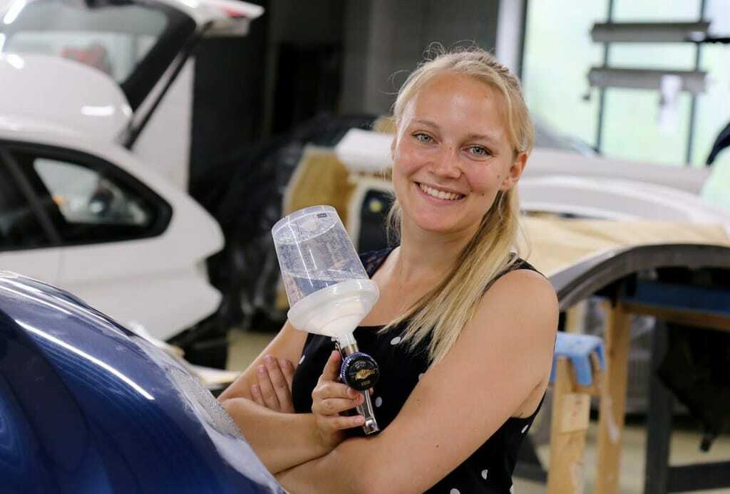 Das blonde Haar zum Zopf gebunden, ein gepunktetes Sommerkleid und ein strahlendes Lächeln dazu. So sieht die Bundessiegerin der Fahrzeuglackierer 2018 aus. Dass sie damit nicht so recht ins vorgefertigte Klischee passen will, ist der 21-Jährigen herzlich egal.“ Für mich ist das ein ganz normaler Job, ich bin quasi auf dem Hof der Lackiererei aufgewachsen“, erzählt die Zwickauerin.