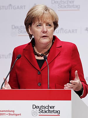 Merkel sagte, sie stehe weiter zu der Zusage, dass es keine Reform der Gewerbesteuer gegen den Deutschen Städtetag geben werde, "sei es aus Einsicht oder aus Einsicht in die Machtverhältnisse", fügte sie hinzu. Zugleich appellierte sie aber an die Kommunen, weiter an Lösungen mitzuarbeiten, um deren Einnahmen auf eine verlässlichere Grundlage zu stellen, auch wenn sie dafür noch keine Lösung sehe. Im Übrigen stiegen mit dem wirtschaftlichen Aufschwung auch die Steuereinnahmen, selbst wenn damit die Ausfälle durch die Finanzkrise nur teilweise kompensiert würden.