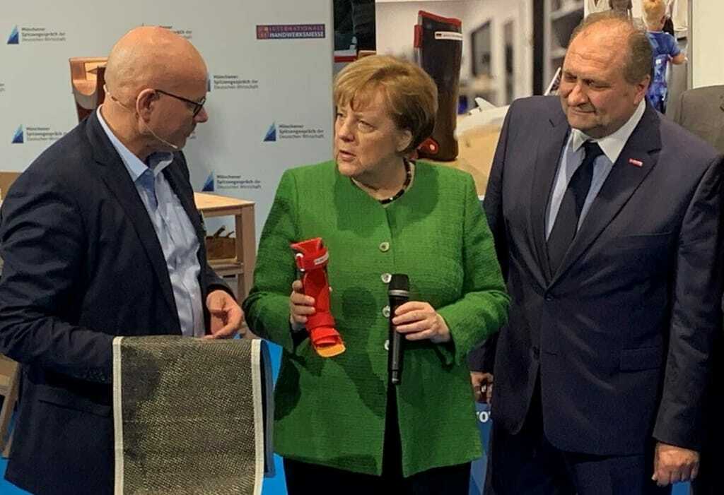 Angela Merkel besuchte auch drei Aussteller auf dem Stand Landes des Handwerks. Einer davon war der Orthopädietechnikbetrieb Strehl aus Bremervörde. Firmenchef Björn Strehl (li.) erläuterte der Bundeskanzlerin und Hans Peter Wollseifer, Präsident des Zentralverbands des Deutschen Handwerks, wie Kinderorthesen aus Carbon-Verschnitt der Airbus-Flugzeugfertigung hergestellt werden. - © Frank Muck