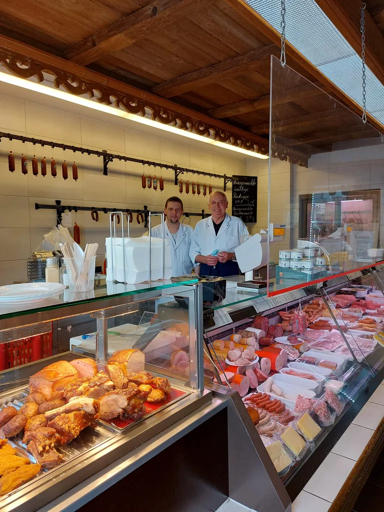 Ignaz Vogl (r.) und Metzgermeister Michi hinter der Wursttheke. - © Maria Poxleitner