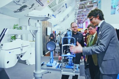 Standmitarbeiter und Besucher im Gespräch auf der Trendmesse opti in München. - © Foto: GHM