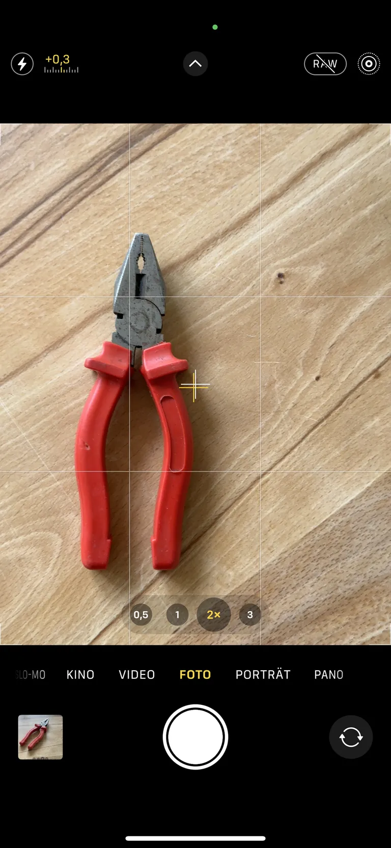 Ich empfehle für solche Aufnahmen das Teleobjektiv zu verwenden. Das funktioniert, indem der Zoom auf 2.0 eingestellt ist. Die Grundeinstellung ist 1.0, also Weitwinkel. Wenn man mit einem Weitwinkel fotografiert, kann es passieren, dass Wände oder Ecken im Bild verzerrt werden. Ein No-Go ist hier das Fotografieren mit einer Einstellung von 0.5, also Ultra-Weitwinkel. Hier stimmen die Proportionen im Bild überhaupt nicht mehr. Der Zoom-Wert wird immer auf dem Display angezeigt, durch Hinein- oder Hinauswischen mit den Fingern verändert sich der Wert.