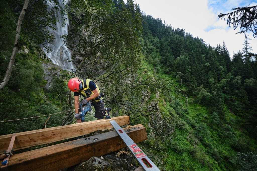 Die Arbeitsumgebung stellt auch hohe Anforderungen an Material und Werkzeuge, mit denen die zwölf Quadratmeter große Aussichtsplattform am Mischbach-Wasserfall errichtet wird. Da es unmöglich ist, ihr Gerät und selbst gefertigten Elemente aus Lindenholz dort hinzutragen, sind die Handwerker auf die Hilfe des Hubschraubers angewiesen. Dass es oben am Berg keinen Strom für die Maschinen gibt, ist die nächste Herausforderung. Deshalb nutzt das Team Bosch Biturbo-Geräte, leistungsstarke Akku-Maschinen, die genauso viel Kraft wie Kabelgeräte liefern. "Früher mussten wir einen Kompressor für die Kabelgeräte auf den Berg tragen. Mit den Akku-Werkzeugen ist die Arbeit einfach, sicher und schnell. Sie sind leicht und die Akkus unter den verschiedenen Geräten kompatibel."
