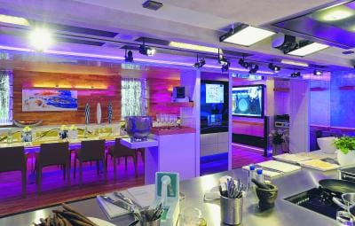 Herdplatten, deren Temperaturen vom Computer aus gesteuert werden können, hochauflösende Monitore mit einem Betriebssystem, das ausschließlich per Gestik bedient wird, ein auf Zuruf reagierendes LED- und Beschallungssystem: Der gute alte Knopfdruck ist hier von gestern. Zahlreiche, kaum sichtbare ferngesteuerte Kameras und extra-geräuschempfindliche Mikrofone zeichnen das, was sich in der Kochschule abspielt, in TV-Qualität auf. So können die Schüler jedes Kurses sich zum Dessert in einem kurzen, professionell geschnittenen Film beim Fleischfilettieren oder beim Einrollen von Gurken-Canneloni zusehen. Temperiert wird der Raum über Klimaanlage und Fußbodenheizung. Er teilt sich in zwei Bereiche: In der Küche mit der freistehenden langgezogenen Arbeitszeile dominiert weißer Hochglanzlack, der Essbereich ist in warmem Olivenholz gehalten. Auch dies ist das Werk der Schreinerei Luther.
