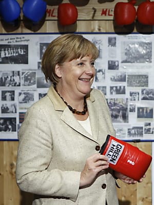 Auf Kommando ihres Trainers boxen zwei Mädchen und drei Jungen in die Luft, immer wieder. Konzentriert führen die Jugendlichen in den roten T-Shirts ihre Bewegungen aus, rufen zum Schluss laut: "Wir sind gegen Gewalt." Vor dem Boxring in dem holzvertäfelten Trainingsraum steht Bundeskanzlerin Angela Merkel (CDU) und sucht anschließend in kleiner Runde das Gespräch mit den Jugendlichen.