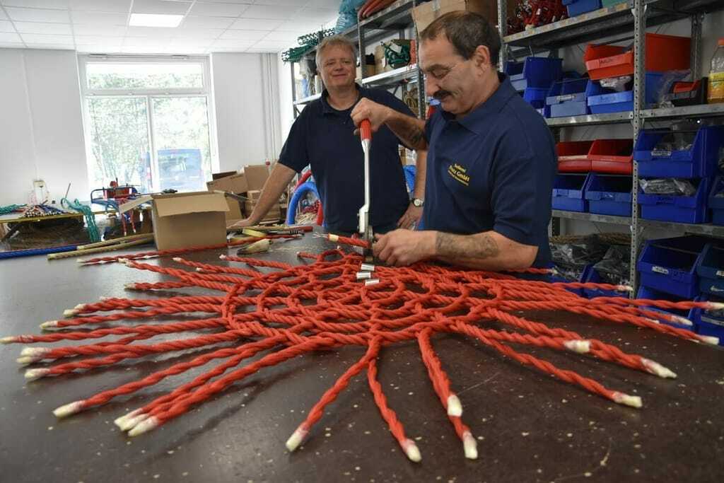 Die Herstellung von Seilerwaren wie Wäscheleinen oder Bindfaden ist mittlerweile nur noch ein Randgeschäft. "Nach der Wende haben wir uns auf Spielgeräte spezialisiert und damit die richtige Lücke gefunden", sagt Thomas Albrecht. Das Machwerk der Seilerei Prutz geht bis in die Schweiz und kann im Kammerbezirk unter anderem auf einem Spielplatz an der Elbstraße in Lutherstadt Wittenberg erprobt werden. Zum Sortiment gehören Strickleitern, Klettertaue oder komplette Lösungen wie Kletterbrücke, Trapeze oder die Nestschaukel, die Dieter Herrmann gerade knüpft. Wie alle anderen Kollegen ist auch er Quereinsteiger und kommt ursprünglich aus der Landwirtschaft. Auch Thomas Albrecht und seine Frau Simone, geborene Prutz, sind als Berufsneulinge in die Firma eingestiegen.