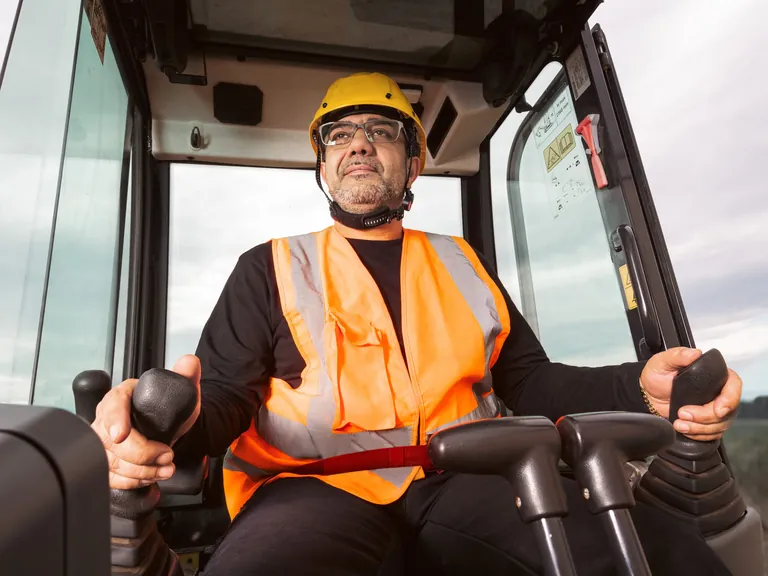 Bauarbeiter mit Helm und Gurt im Baufahrzeug