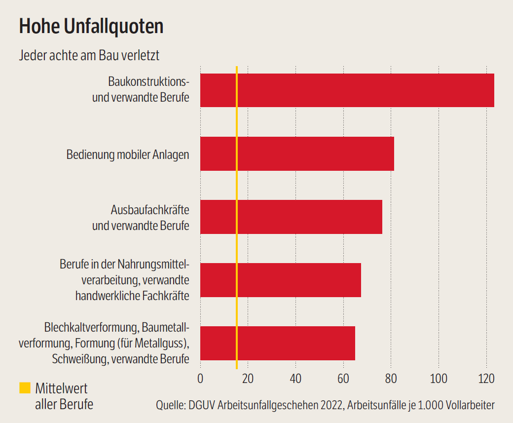 Beschäftigte in der Baukonstruktion wie Zimmerer oder Maurer haben ein vielfach höheres Risiko, bei der Arbeit einen Unfall zu erleiden als der Durchschnitt der Beschäftigten. - © Quelle: DGUV, Grafik: DHZ