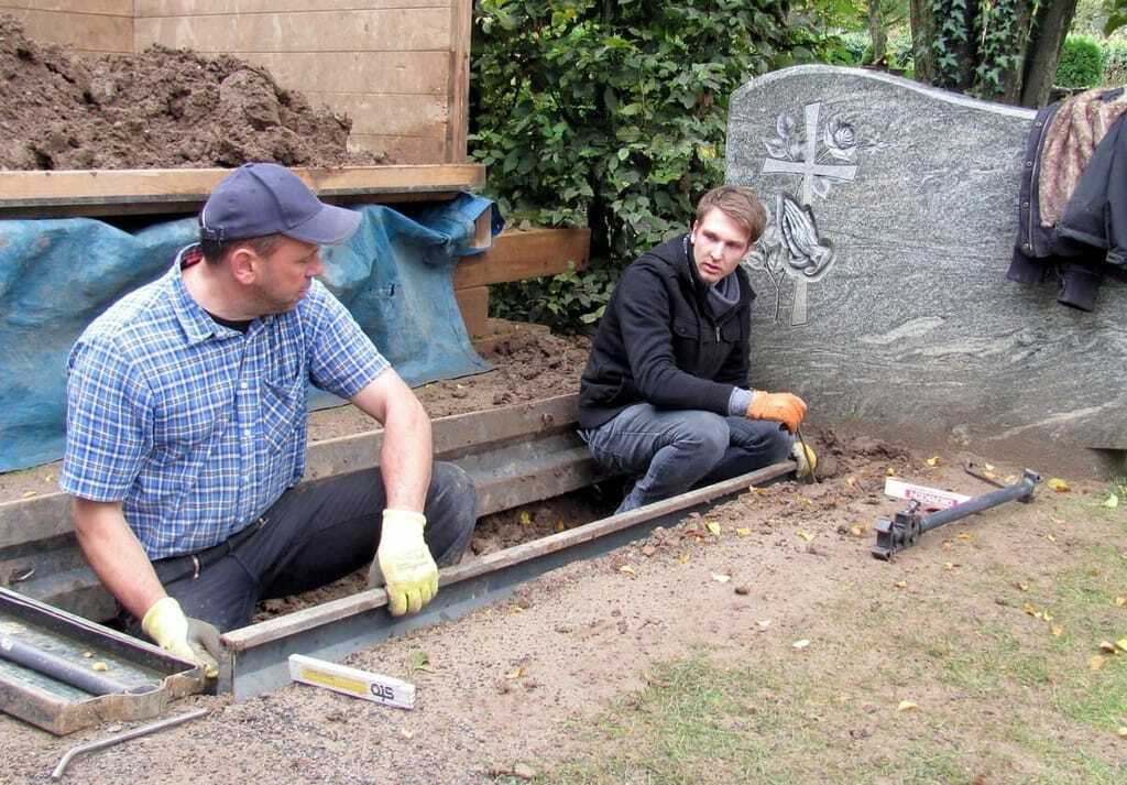 Bestatten auf Probe: Dozent und Bestattermeister Stefan Rommel (links) zeigt Azubi Tim Schneider auf dem Lehrfriedhof, wie eine Grabschalung anzulegen ist.