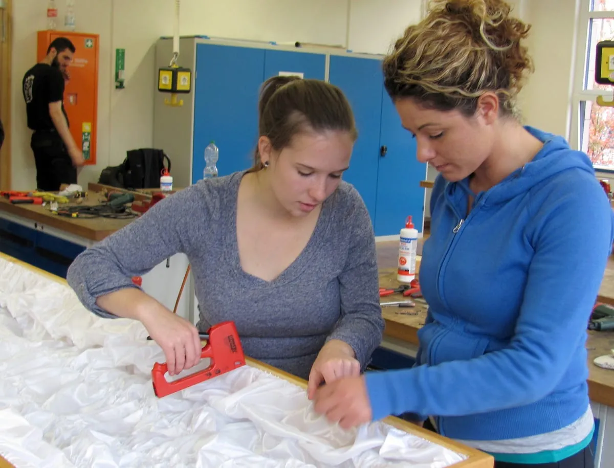 Teamwork: Zu zweit fällt den angehenden Bestatterinnen Laila Sebert (links) und Büsra Tekes das Auskleiden des Sarginneren deutlich leichter. - © Foto: Sebastian Kirschner