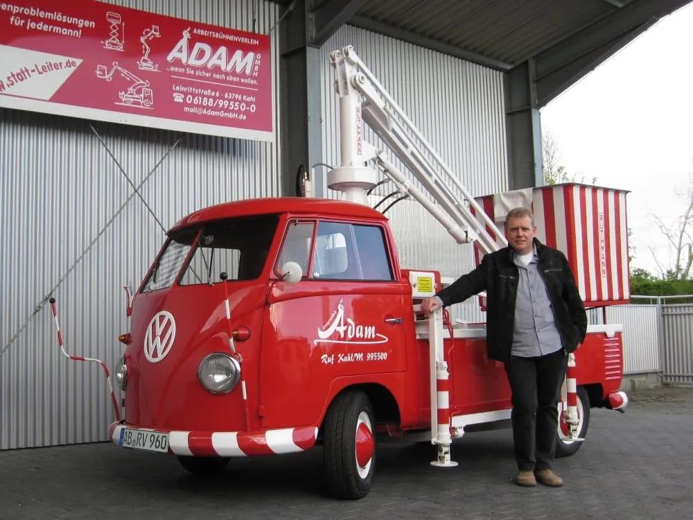 Der ehemalige Fußbodenleger betreibt heute einen Verleih für Arbeitsbühnen. Auffällig ster Werbeträger für das Unternehmen ist ebenfalls ein Bulli der er sten Generation, ausgerü stet mit einer hydraulischen Hebebühne vom Typ V60 der Firma Ruthmann.