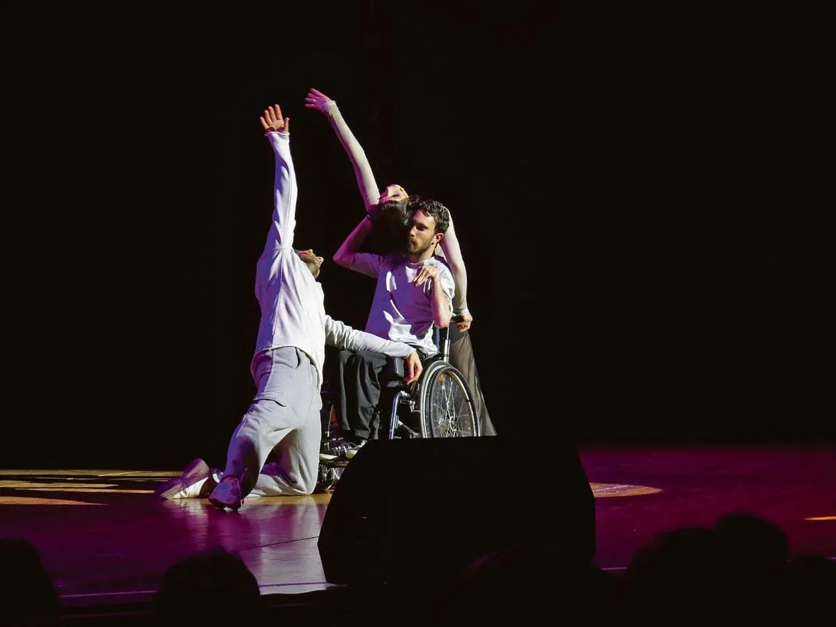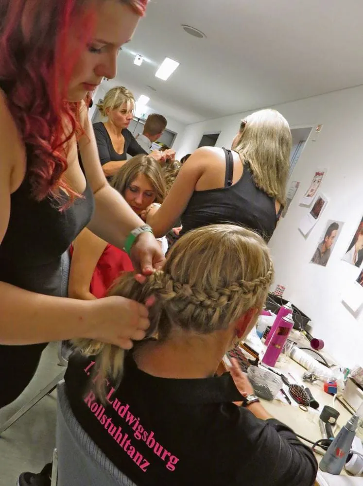 Eng sind die Gänge in den Katakomben des Hegel-Saals in der Stuttgarter Liederhalle, wo in wenigen Stunden Tänzer und Sänger mit und ohne Behinderung gemeinsam auf der Bühne stehen werden. Von oben hört man noch die letzten Proben, während hier schon geschäftiges Treiben herrscht: Lange Tische sind beladen mit Haarspraydosen und Make-up-Paletten. Davor bewegen sich – flechtend, toupierend und Lidstriche ziehend – 27 schwarz gekleidete Stylistinnen flink um die Darsteller aus sechs Stuttgarter Tanzschulen herum.