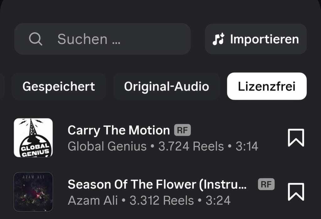 Erreichbar ist die Sound-Collection über die Meta Business Suite. Dieses kostenlose Social-Media-Verwaltungstool von Meta gibt es als Desktop-Anwendung und mit eingeschränkten Funktionen auch als App. Die Titel und Soundeffekte aus der Sound-Collection sind auch in der Musikbibliothek auf Instagram verfügbar. Lange Zeit waren die für kommerzielle Inhalte freigegebenen Musikstücke innerhalb der App nicht vom übrigen Musikangebot zu unterscheiden. Das ändert sich jedoch: Auf den meisten Geräten ist Musik, die lizenzfrei innerhalb von Instagram genutzt werden darf, mittlerweile mit einem RF (Rights-Free / Royalty-Free) gekennzeichnet. Eine Stichprobe unserer Redaktion hat allerdings ergeben, dass diese Kennzeichnung noch nicht flächendeckend verfügbar ist.