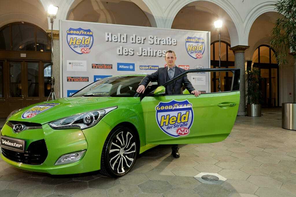 Goodyear und der Automobilclub von Deutschland zeichnen jeden Monat Menschen aus, die durch ihr mutiges Handeln anderen Verkehrsteilnehmern das Leben retten oder schwere Unfälle verhindern. Aus den Helden der einzelnen Monate wurde der LKW-Fahrer Fluh nun von einer Fachjury zum Held der Straße des Jahres gewählt. Neben der Auszeichnung gewann der LKW-Fahrer einen Hyundai Veloster im Gesamtwert von 21.600 Euro und eine Autoversicherung der Allianz für ein Jahr.