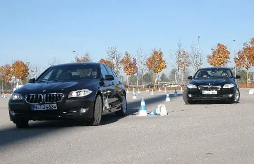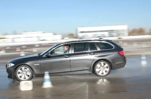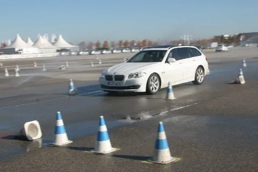Ein 5er BMW besteht aus rund 20.000 Einzelteilen. Wie gut diese im Zusammenspiel funktionieren, lässt sich am besten bei einem Fahrersicherheitstraining testen. Vier Stationen hatte BMW auf dem Flugplatzgelände zwischen Hangars und Startbahn vorbereitet, um den Teilnehmern die Vorzüge des 5er zu zeigen. Vorzüge wie die Integralaktivlenkung, die dank mitlenkender Hinterachse den Fahrer in Parkhaussituationen oder bei schnellen Kurvenfahrten unterstützt. Bei Tempo unter 50 km/h steuern die Hinterräder leicht gegen, bei höheren Geschwindigkeiten die Vorderräder. Dadurch sinkt der Wendekreis um 90 cm und der 5er wird wendig wie ein 3er BMW mit konventioneller Lenkung, erklärt Instruktor Dieter Schöner den Handwerkern.