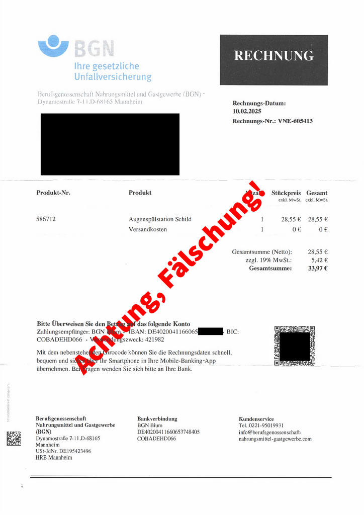 Die betrügerischen Schreiben sind mit hoher krimineller Energie erstellt worden. Sowohl das Anschreiben als auch die Rechnung enthalten eine gefälschte BGN-Telefonnummer, die offenbar zu einem Call-Center im Ausland führt. Die angegebene E-Mail-Adresse "berufsgenossenschaft-nahrungsmittel-gastgewerbe.com" leitet auf die echte BGN-Website weiter – ein gezieltes Täuschungsmanöver. Zudem verwenden die Betrüger mittlerweile variierende Domain-Namen, um ihre Machenschaften zu verschleiern.