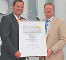 Der 35-jährige Firmenchef von OBO, Andreas Bettermann, erhielt vom Leiter des Bundesleistungswettbewerbs der E-Jugend, Manfred Köhler, die Urkunde für die Schirmherrschaft. Foto: OBO/ZVEH