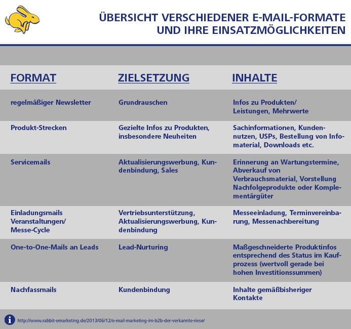 Für die Kommunikation von Unternehmen an Unternehmen eignen sich verschiedene E-Mail-Formate. Je nach Produkt, Zielgruppe und Ziel kommen Produkt-Strecken, Servicemails, Newsletter und andere in Betracht (siehe Grafik). Analysieren Sie zuallererst, wie Ihre anvisierten Zielgruppen Kaufentscheidungen treffen.