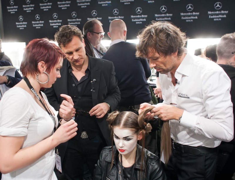 Starfriseur André Märtens (rechts) ist einer von vielen Handwerkern, die hinter den Kulissen der Fashion Week für einen reibungslosen Ablauf garantieren. - © Eugen Mai