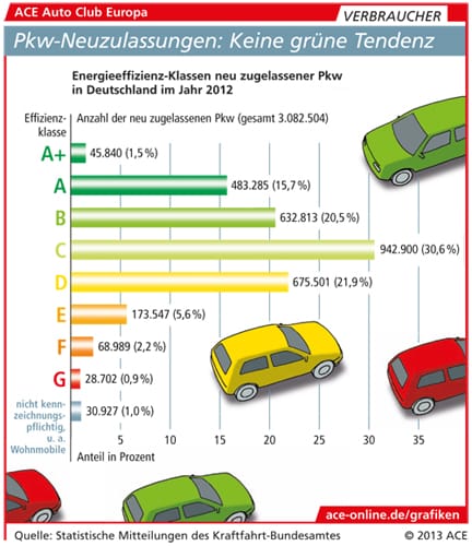 Der Auto Club Europa (ACE) zieht in einer aktuellen Untersuchung den gleichen Schluss: Für Autokäufer sei das Öko-Label nicht richtungsweisend. In einer Untersuchung der Zulassungszahlen des Kraftfahrtbundesamtes (KBA) für das Jahr 2012 fielen lediglich 37,7 Prozent aller im Jahr 2012 neu zugelassenen Pkw unter die günstigen Energieeffizienzklassen A+, A oder B, so der ACE.