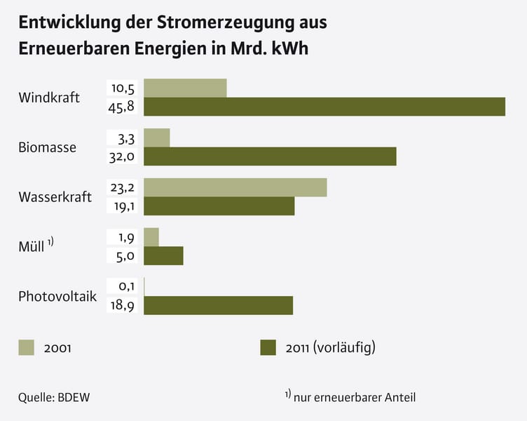 Dass hierbei vor allem der Boom der erneuerbaren Energien eine Rolle spielt, zeigt sich daran, dass im gesamten Jahr 2011 deutsche Stromausfuhren die Einfuhren lediglich um 2,2 Terawattstunden übertrafen. Hier zeigen sich die Veränderungen in der deutschen Stromproduktion sehr deutlich.