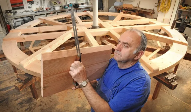 Hans Karel arbeitet dagegen mehr in der Werkstatt in Mulda. Hier werden die Mühlräder angefertigt und dann wieder in ihre Einzelteile zerlegt und an den Auftragsort gebracht. Dort werden sie wieder zusammengesetzt. "Es gehören viel handwerkliches Geschick, Wissen und noch mehr Erfahrung dazu. Daran hat sich trotz moderner Technik nichts geändert. Denn die meisten alten denkmalgeschützten Mühlen sind eng und man kann nicht einfach mit einem Autokran anrücken."