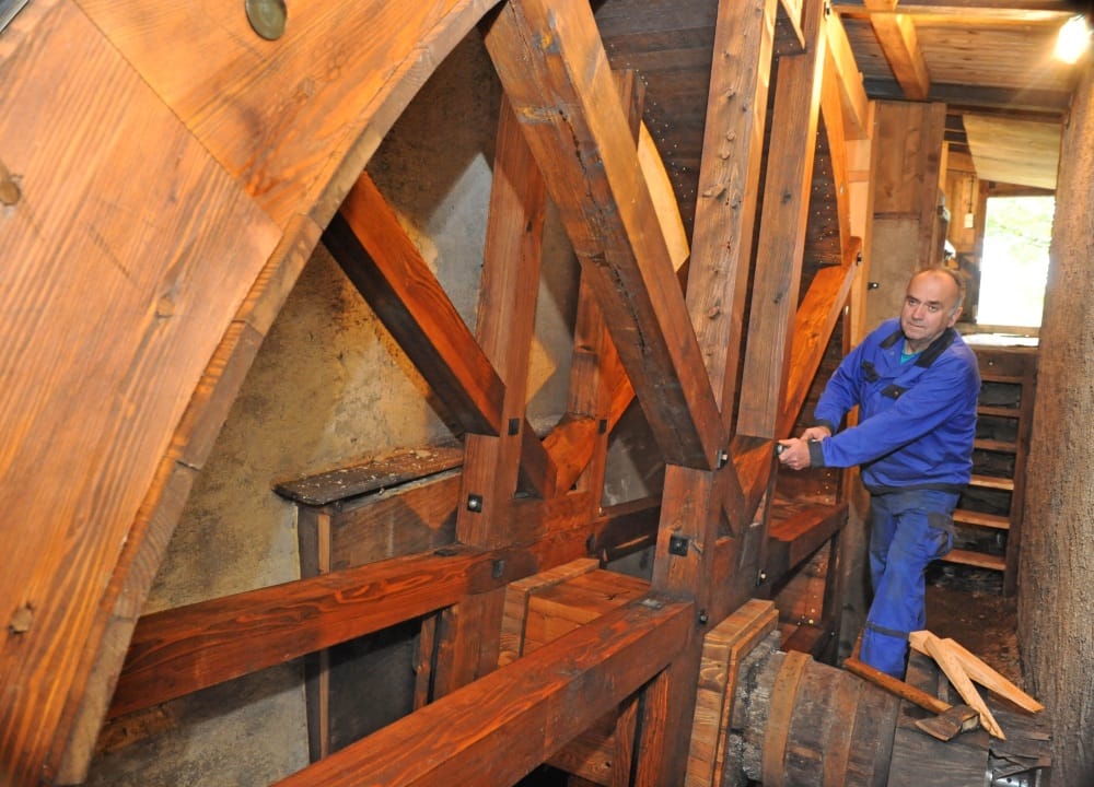 "Ich war damals der jüngste Mitarbeiter bei Mühlenbau Schumann und wurde sozusagen ins kalte Wasser geschubst", erinnert sich Hans Karel. Das hieß, er musste in den schmalen Wassergraben steigen, damit die Handwerker das Wasserrad einbauen konnten. Das sei heute noch genauso.