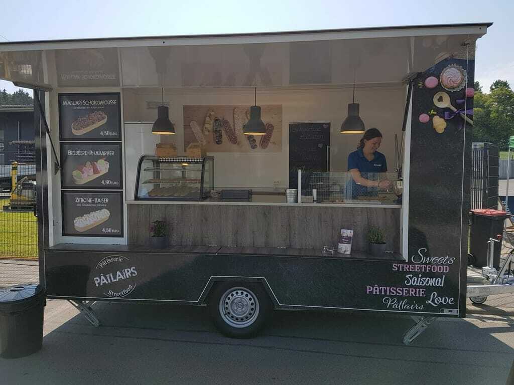 Die Pâtlairs werden den Kunden der mobilen Pâtisserie im Streetfood-Anhänger direkt vor den Augen zubereitet. Die Mürbeteigschalen werden mit weißer Schokolade ausgestrichen, damit sie nicht aufweichen. Dann wird eine Creme aus hochwertigen Zutaten wie Schokolade aus Madagaskar mit einer Tülle und einer tausendfach einstudierten Handbewegung kunstvoll in den Pâtlairs aufdressiert, wie Müller es nennt. "Das ist der schwierigste Schritt und zugleich der wichtigste. Das Auge isst schließlich mit", sagt Müller. Zum Schluss wird das Pâtlairs mit Baiser, Beeren oder Crumble garniert.