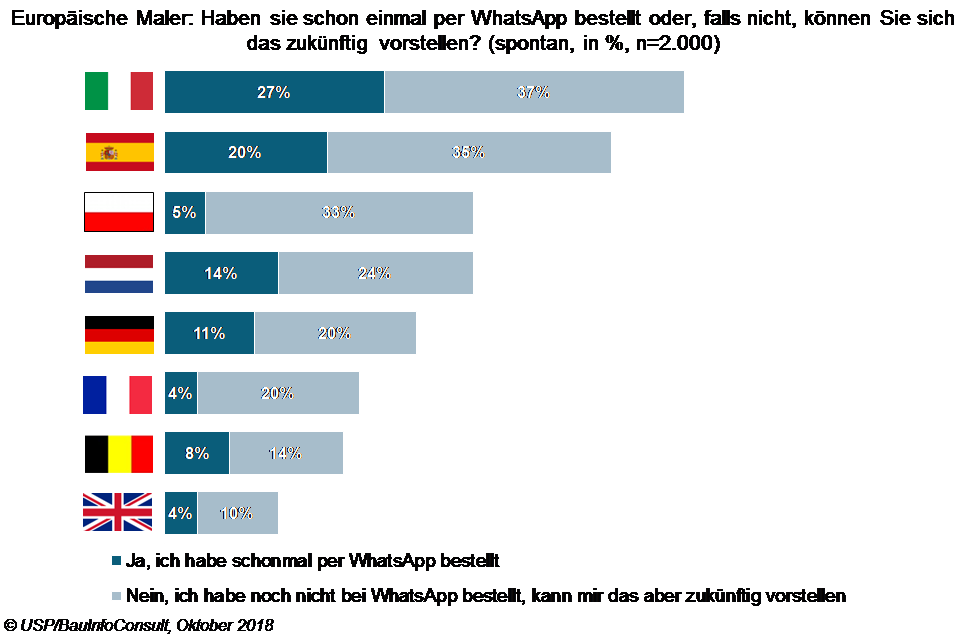 Das Marktforschungsinstitut fragte bei rund 2.000 Malern aus Italien, Spanien, Polen, Deutschland, Frankreich, Belgien, Großbritannien und den Niederlanden nach, ob sie schon einmal per WhatsApp bei einem Händler bestellt haben. Das Ergebnis: Etwa elf Prozent der Teilnehmer haben den Messenger bereits für Materialbestellungen genutzt, weitere 24 Prozent könnten es sich vorstellen.
