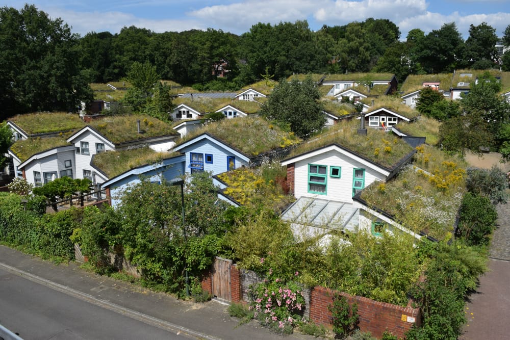 Eine Ökosiedlung in Düsseldorf-Unterbach: Hier gehören Gründächer ganz grundsätzlich ins Konzept. - © Bundesverband GebäudeGrün