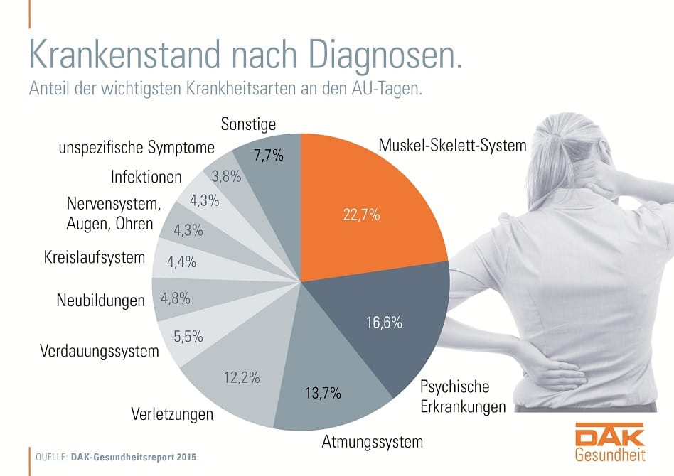 Insgesamt sind psychische Erkrankungen sind auf dem Vormarsch. 59 Millionen Arbeitsunfähigkeitstage pro Jahr gehen vor allem auf Depressionen, Angststörungen und Suchterkrankungen zurück. Damit machen sie 15 Prozent des Arbeitsunfähigkeitsgeschehens aus und sind die zweithäufigste Diagnosegruppe bei Krankschreibungen.