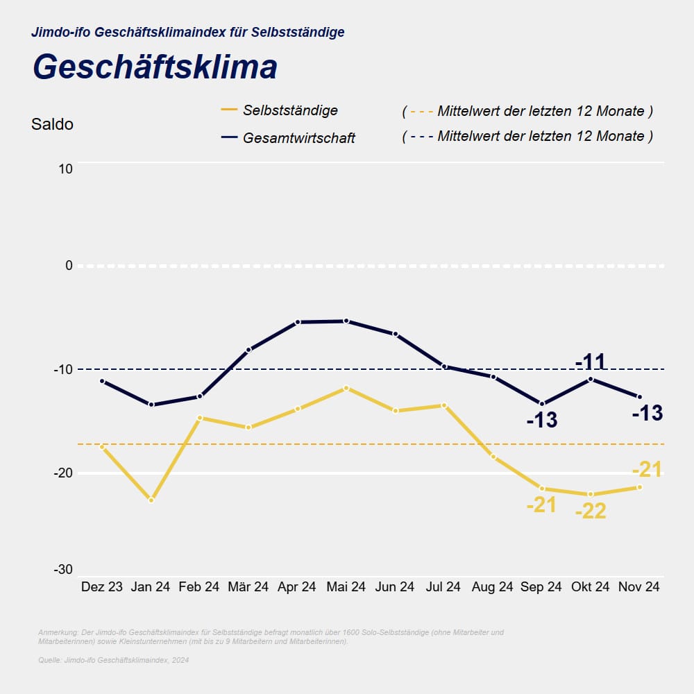 Im Rahmen der Umfragen des Jimdo-ifo Geschäftsklimaindex befragen die Wirtschaftsforscher des Münchner ifo Instituts im Auftrag des Internetdienstleisters jeden Monat Betriebe mit weniger als neun Mitarbeitern. Damit wollen sie speziell für die Soloselbstständigen und Kleinbetriebe, die den Großteil der Unternehmen in Deutschland ausmachen, ein eigenes konjunkturellen Stimmungsbild aufzeigen. In den vergangenen Monaten war dieses sehr negativ geprägt – und leider geht es 2025 so weiter.