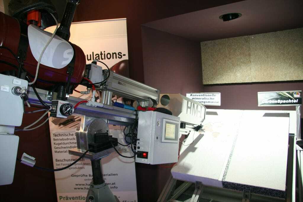 Drei Unternehmen, die mit Carbon arbeiten, sind Caparol, alsecco und Lithodecor. Ihre Fassadendämmsysteme sind extrem robust und die Oberflächen, nach eigenen Angaben, bis zu 70 Joule belastbar. Dies zeigten sie auch mit einer Hagelschussmaschine am Stand unter Beweis. Aber auch andere Materialien, wie Hanf, werden hier zu Dammwänden verarbeitet.