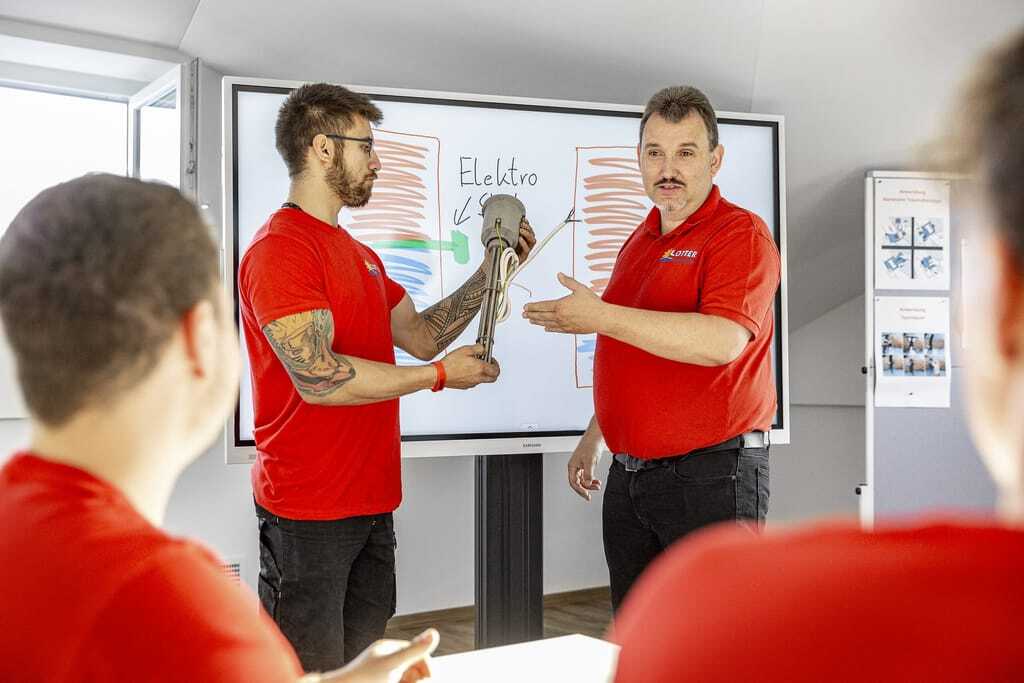 Im hauseigenen Seminarraum bekommen die Lehrlinge durch Lotter und sein Team einen Überblick über die Funktionsweisen von Heizsystemen, lernen aber beispielsweise auch, wie sie Stundenzettel korrekt ausfüllen – wichtige Voraussetzung für einen reibungslosen Ablauf im Büro. Auch Sicherheitsunterweisungen finden in dieser ersten Woche statt. In der Mitte der Einführungswoche haben die Azubis dann Material- und Werkzeugkunde inklusive praktischer Übungen.