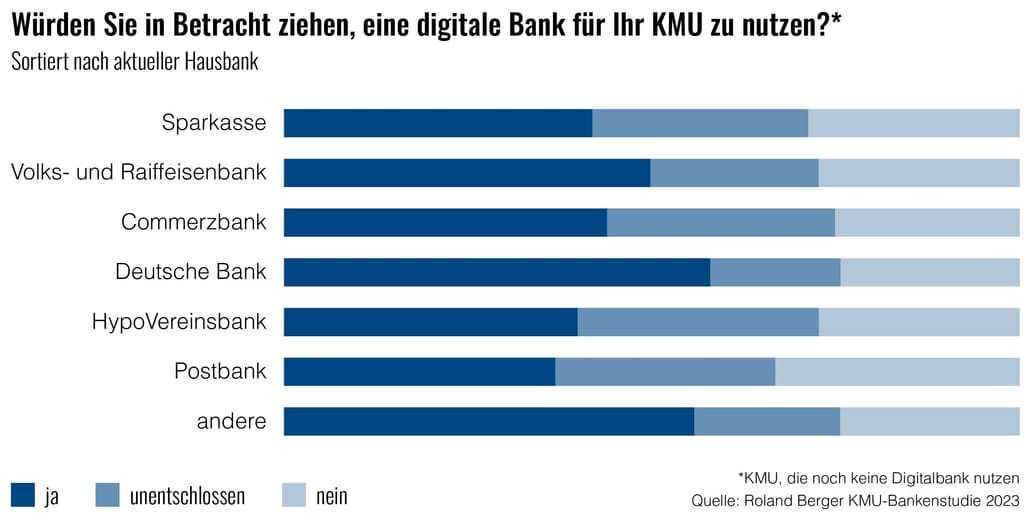 Auch im Finanzbereich steht den Unternehmerinnen und Unternehmern eine immer größere Auswahl an Finanzdienstleistern zur Verfügung, die mit smarten Technologien und digitalen Lösungen punkten. Wie eine aktuelle Studie von Roland Berger zeigt, ist das Interesse gegenüber diesen Angeboten groß. So denkt jedes zweite kleine oder mittelständische Unternehmen, das bisher noch nicht Kunde einer digitalen Bank ist, über einen Wechsel nach. Entscheidende Schlüsselkriterien sind dabei unter anderem schnelle Prozesse, guter Kundenservice sowie bessere Zinskonditionen.